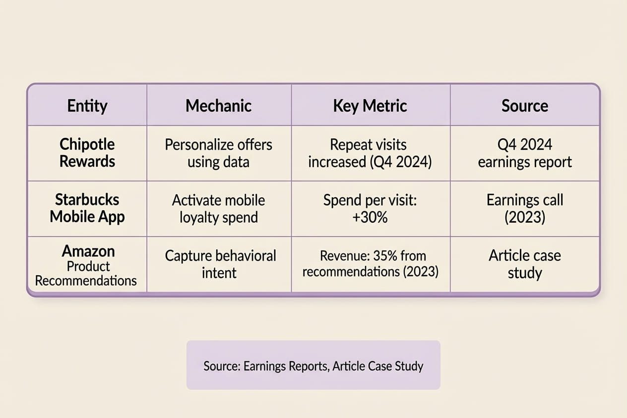 Customer-centric strategies use behavioral data and personalization to increase repeat purchase rate and customer lifetime value. The mechanic in each case below is the same: use transaction or behavioral data to make the next interaction more relevant than the last.