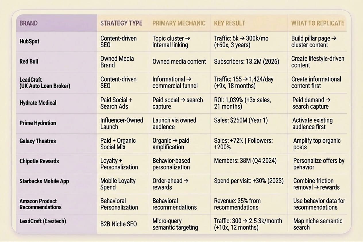The 10 marketing strategy examples in this article span four strategy types — content-driven, social media, customer-centric, and B2B niche — each with verified data, a named mechanic, and a replication framework you can apply. Every example below answers the same question: what exactly did they do, and why did it produce measurable results.