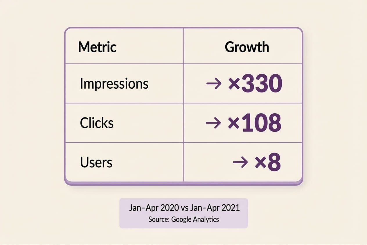 Within one year, 90% of Ereztech’s product pages reached Google top-10. Comparing January–April 2020 to January–April 2021: impressions grew 330x, clicks 108x, unique users 8x. The replicable mechanic: in niche B2B markets, standard keyword tools undercount real search demand. Manual semantic research that maps how specialists actually search for products produces higher-intent traffic than volume-based keyword targeting.