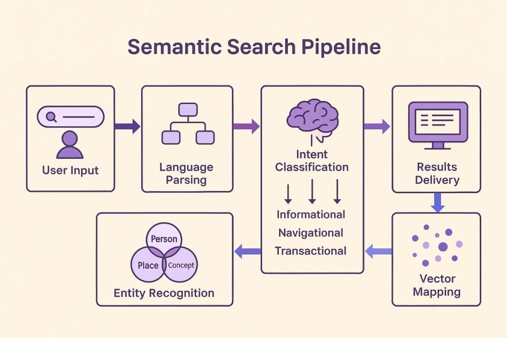 Effective search intent understanding is central to delivering relevant results. Every query falls into one of four categories: informational searches (seeking knowledge), navigational searches (looking for a specific website or page), commercial intent (researching before purchase), and transactional searches (ready to act or buy). A semantic search system identifies the intent type behind each query and adapts the results accordingly. This approach ensures users receive not only accurate but purpose-driven information, aligning content delivery with their goals and improving overall engagement and satisfaction.