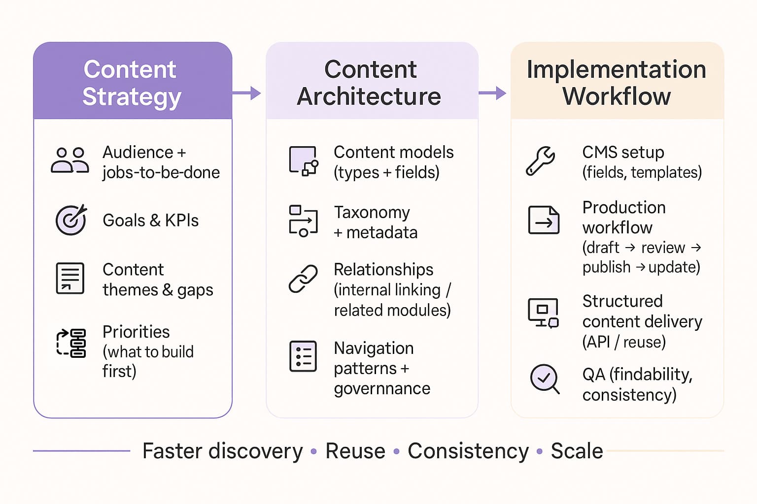 Faster Time-to-Market: With clear content models and workflows, new content moves from concept to publication faster. Teams spend less time figuring out where content belongs and more time creating valuable material.
