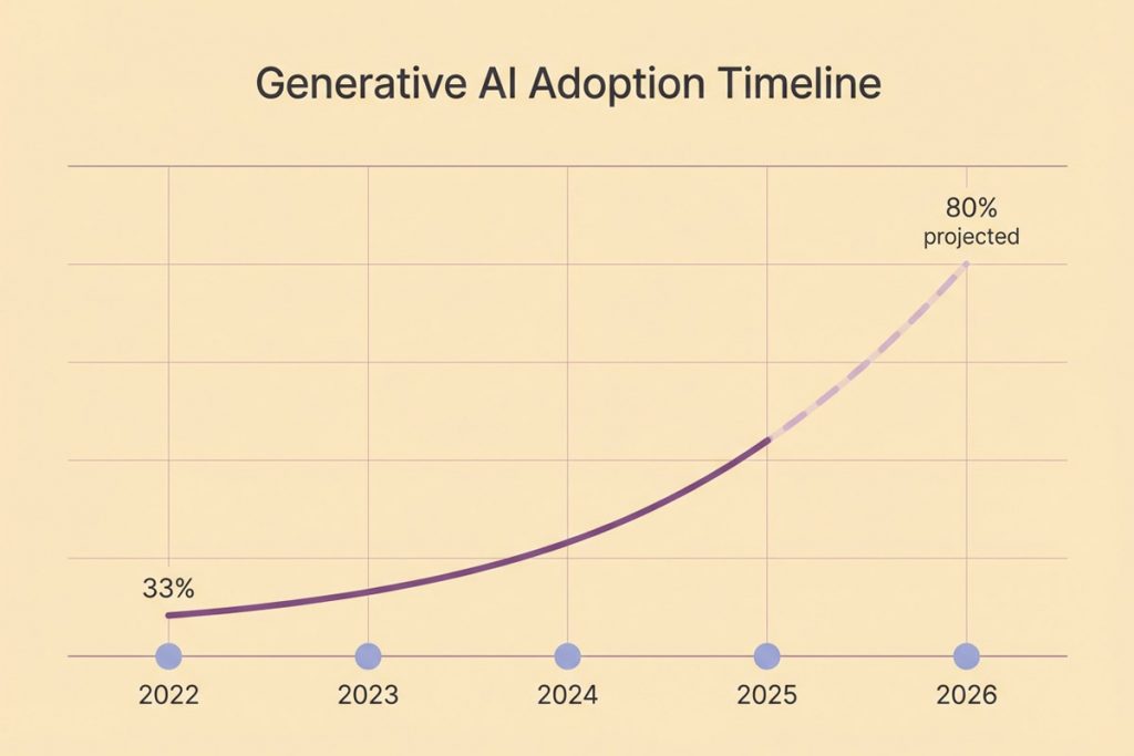 Adoption is accelerating faster than any previous enterprise technology. Currently, 33% of organizations use generative AI according to McKinsey’s 2024 research. Gartner projects that figure will hit 80% by 2026—a transformation happening in just four years from ChatGPT’s launch.