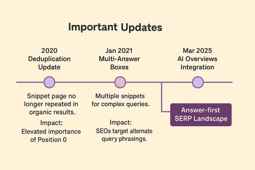 Google Algorithm Updates constantly reshape snippets. Several significant updates have shaped Answer Box optimization strategies in recent years. In 2020, Google eliminated the “double listing” where Answer Box sources could also appear in regular organic results, making position zero even more valuable for traffic capture.