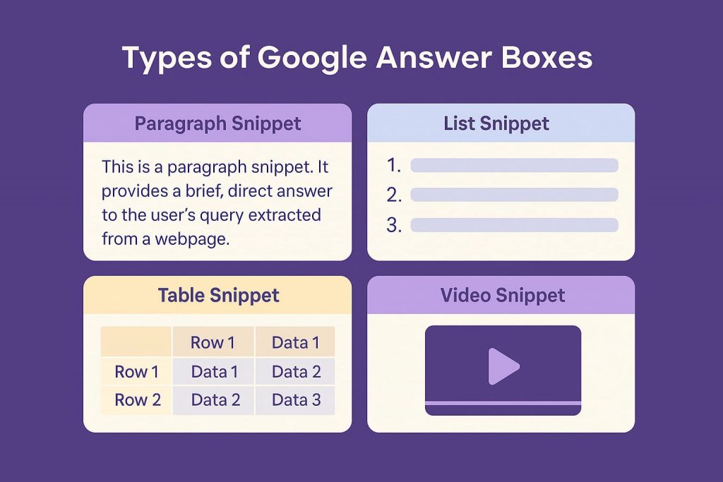 Formats include paragraph snippets, lists, tables, and videos. Each serves different query intents: definitions, how-to steps, comparisons, or tutorials. Knowing which type applies to your niche helps refine optimization strategies.