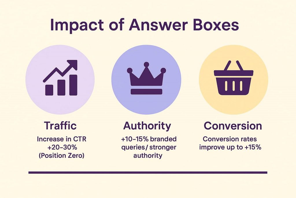 - Visibility & authority: Securing a Google Answer Box boosts brand recognition and establishes topical authority.
