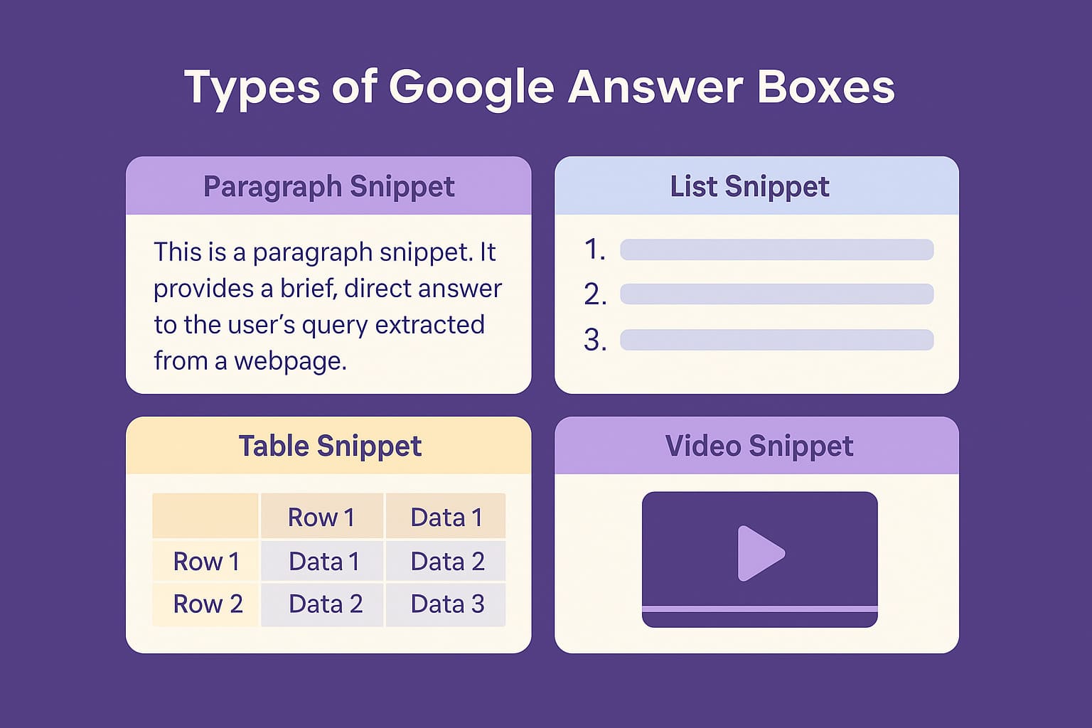 Formats include paragraph snippets, lists, tables, and videos. Each serves different query intents: definitions, how-to steps, comparisons, or tutorials. Knowing which type applies to your niche helps refine optimization strategies.