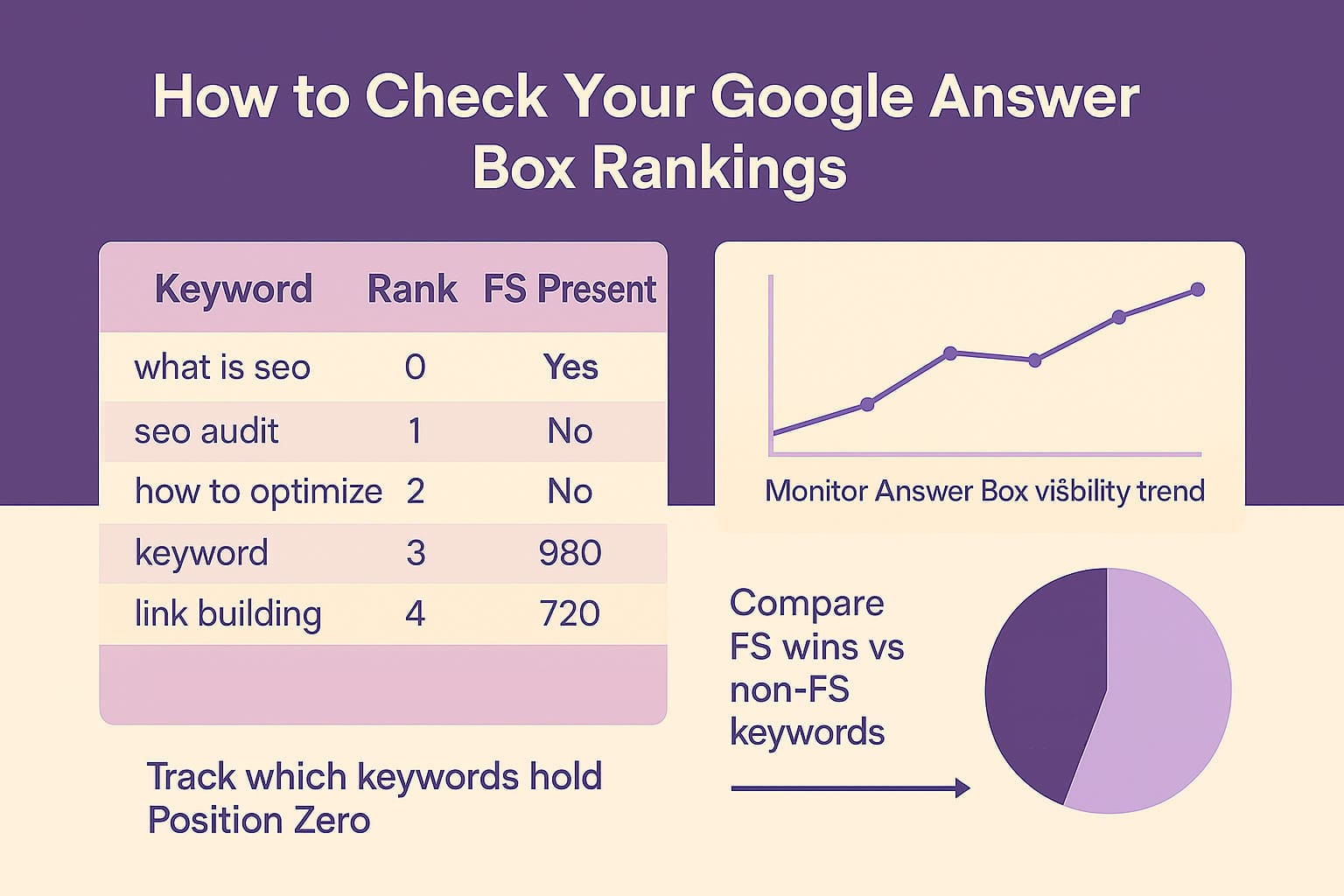 To track answer boxes, begin with Google Search Console. It shows impressions and clicks for queries where your page appears in a Featured Snippet at Position Zero. Pair this with analytics tools to measure changes in CTR, traffic quality, and overall search visibility. Platforms such as SEMrush and Ahrefs provide deeper monitoring, flagging when your site gains or loses specific SERP features. Together, these tools give a clear picture of ROI: more visibility, stronger engagement, and sustained presence in the Google Answer Box.