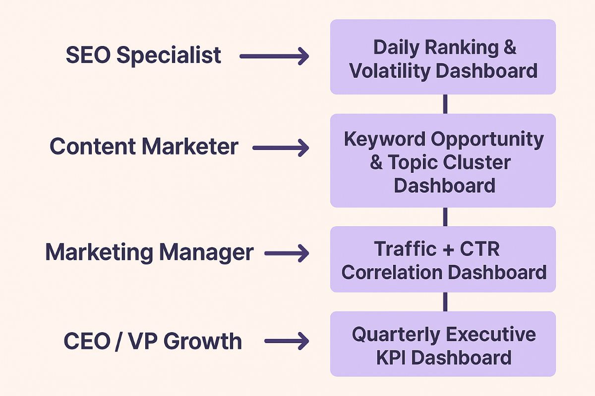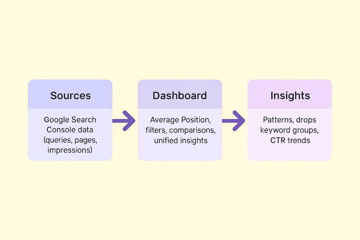 Google Looker Studio enables personalized tracking. After you connect GSC and the rank tracker via API, you create a position change chart, add a CTR-versus-position plot, include a top movers table, and set comparison periods.