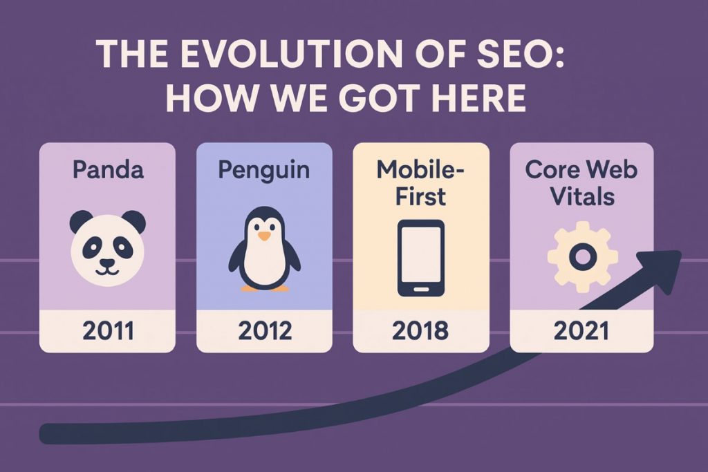 Google’s Panda update in 2011 targeted low-quality content farms. Penguin update followed in 2012, attacking manipulative link schemes. Mobile-first indexing in 2018 forced another evolution. Core Web Vitals in 2021 made page experience a ranking factor.