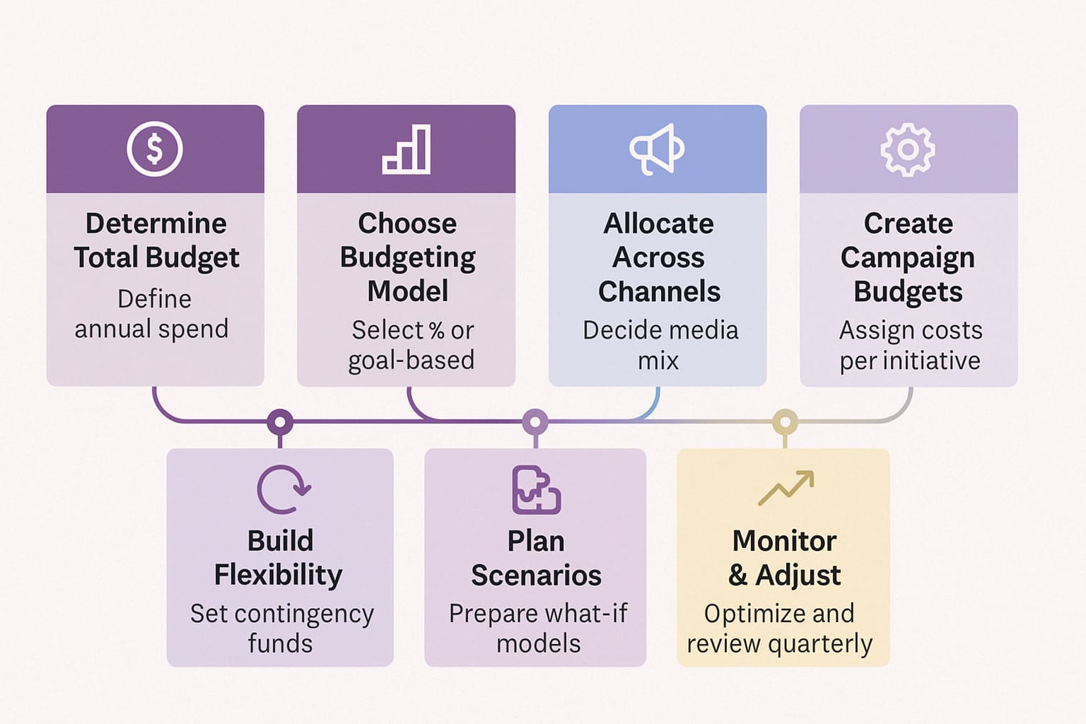 Start by defining your goals, analyzing past performance, and choosing a budgeting model. Allocate funds by channel and review quarterly to ensure efficiency.