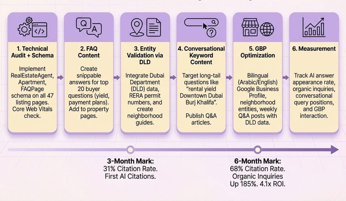 • Month 3: DLD data integration + neighborhood guides, citation rate 31%.