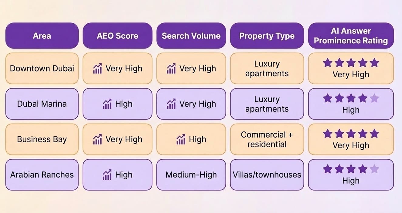 • Business Bay (commercial and residential, Very High AEO potential) benefits greatly from AEO. Complex investor queries like “commercial vs. residential ROI Business Bay 2025” are exactly what AI systems prefer to answer.