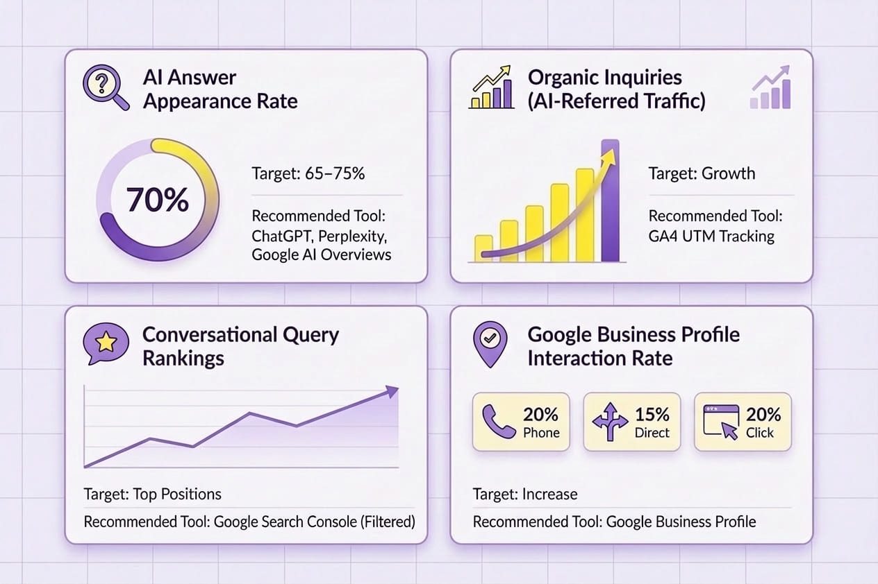 • AI answer appearance rate: query ChatGPT, Perplexity, Google AI Overviews weekly; target 65–75%