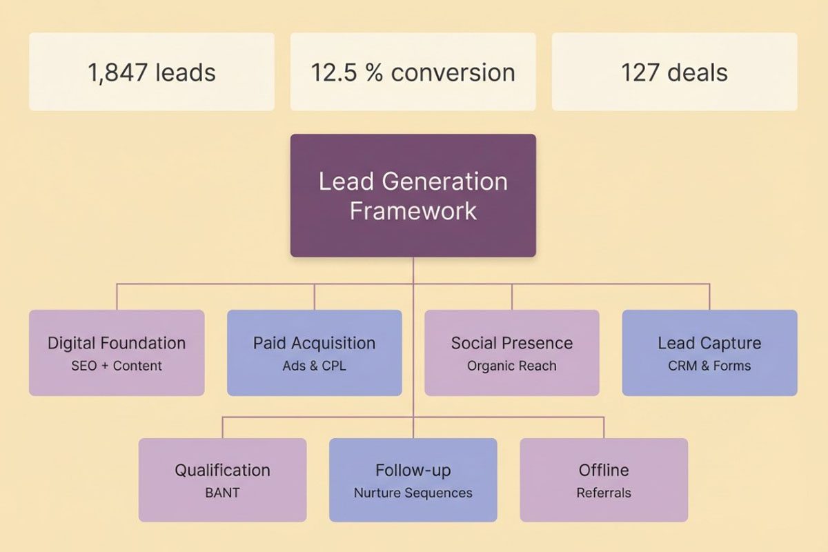 System Recap: The 7-component framework integrates digital scale (Google Ads, Facebook/Instagram, SEO, video), offline depth (networking, community), systematic qualification (BANT), persistent nurturing (12-touch sequences), rigorous tracking – creating a predictable machine generating 500+ leads monthly converting at 12.5%.