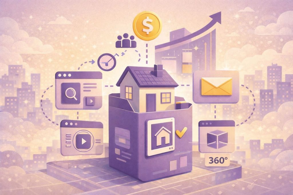 Today’s property buyers start with a Google search, often at 10 PM while scrolling through listings on their phones. Effective real estate marketing in 2026 requires a multi-channel digital approach. This approach involves combining high-impact visual content, targeted lead generation, and data-driven optimization tracking.