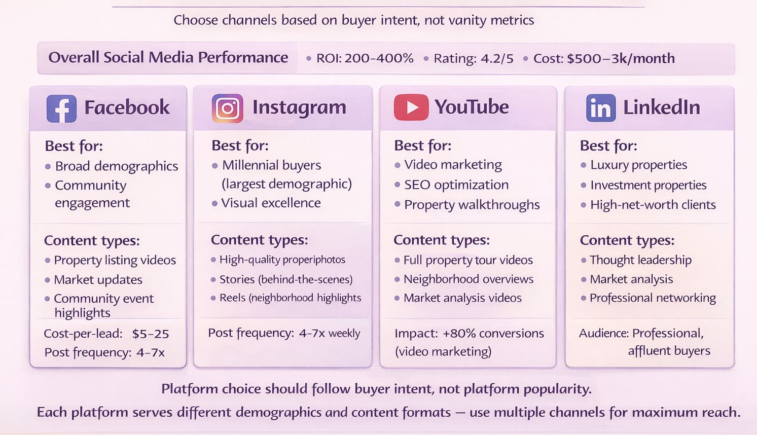 - Property showcases → Instagram, Facebook, YouTube, listing sites