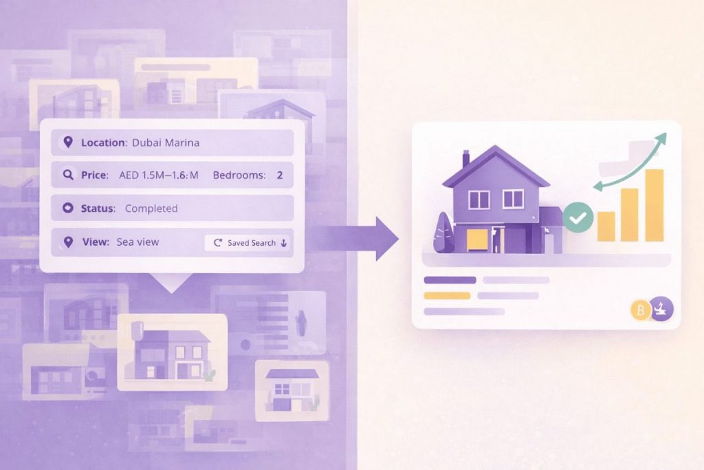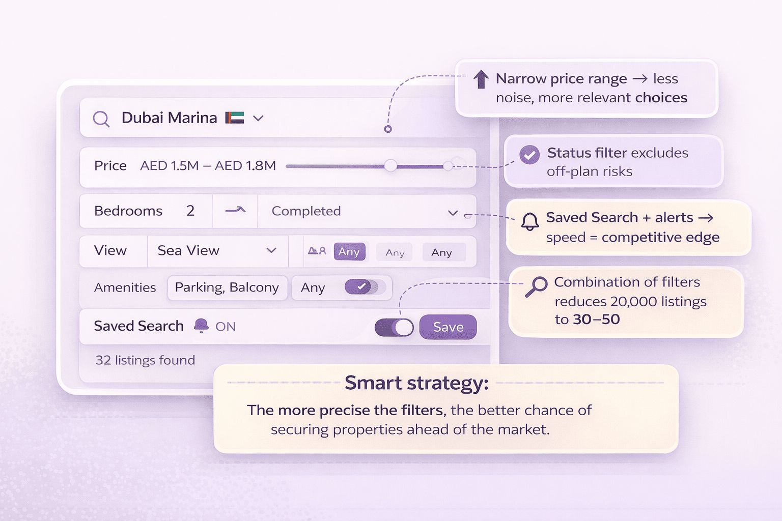 - Create hyper-specific saved searches. Use 15+ filters: location, price, bedrooms, completion status, view type, amenities.