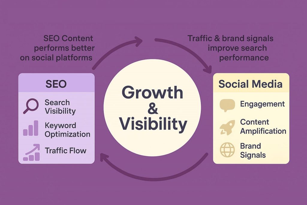 Think of SEO and social media as two engines powering the same vehicle. Search optimization builds your foundation—the long-term visibility that drives consistent traffic. Social media acts as the accelerator, amplifying reach and creating immediate engagement that feeds back into search performance.