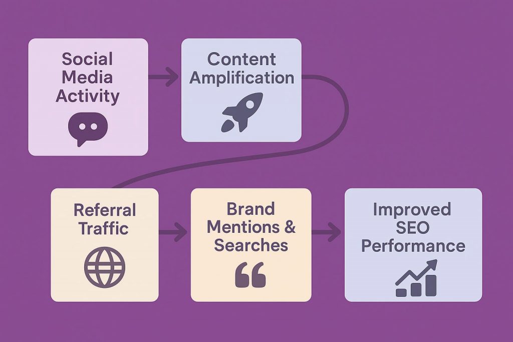 Social Media Activity → Content Amplification → Increased Visibility → Traffic Generation → Engagement Signals → Link Opportunities → Authority Building → Improved Rankings → More Visibility (cycle continues)