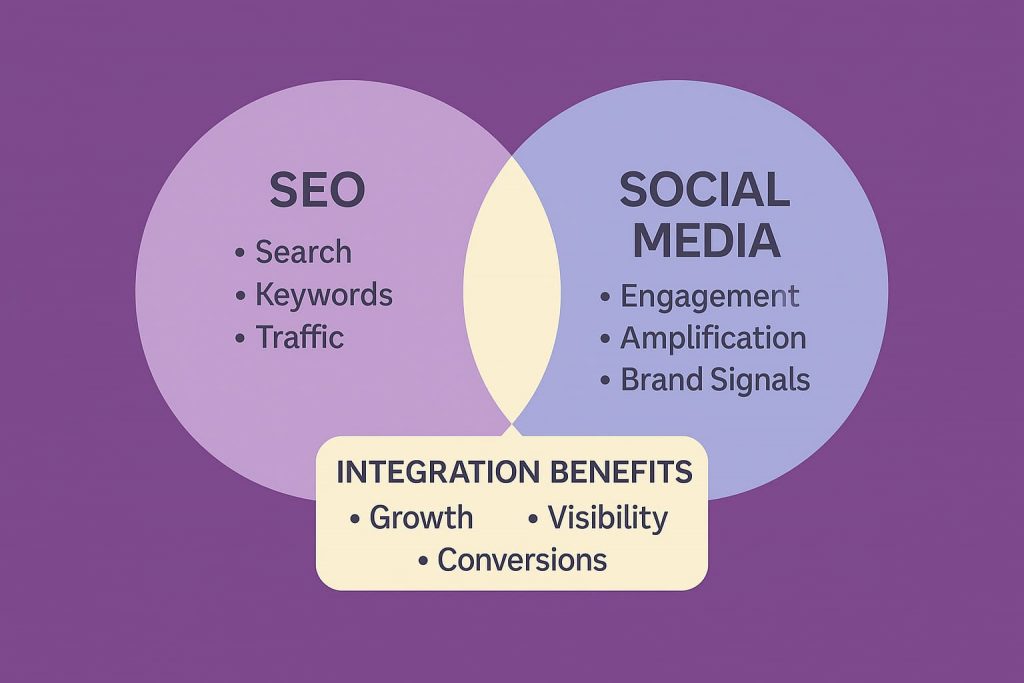 Integration amplifies content reach, drives qualified traffic that improves engagement metrics, generates backlinks through increased visibility, builds brand awareness that creates search demand, and provides audience insights that improve both strategies simultaneously.