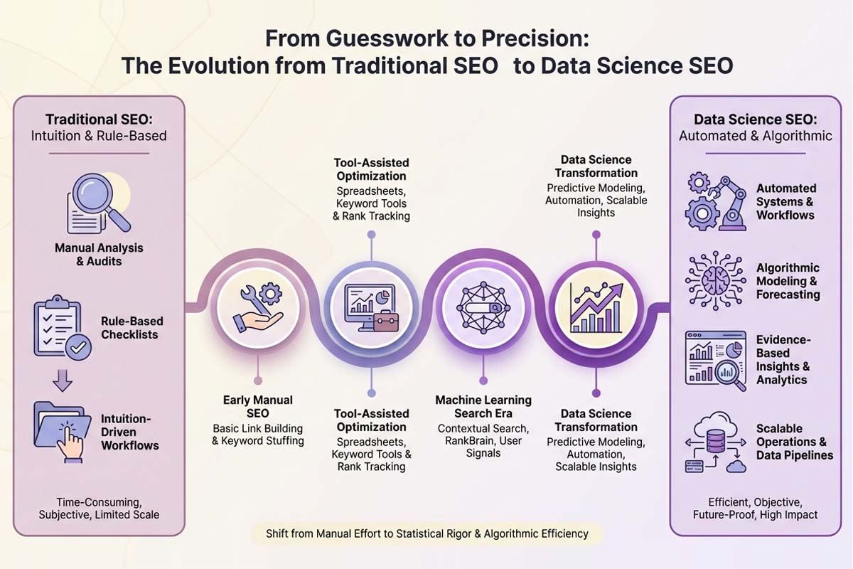 The SEO landscape has evolved beyond manual analysis and intuition-based decisions. Data science brings systematic methodology to search optimization—statistical rigor, predictive modeling, and automated processing at scale. Where traditional SEO relies on best practices and periodic manual audits, data science SEO uses algorithms to identify patterns, test hypotheses, and optimize continuously based on evidence.