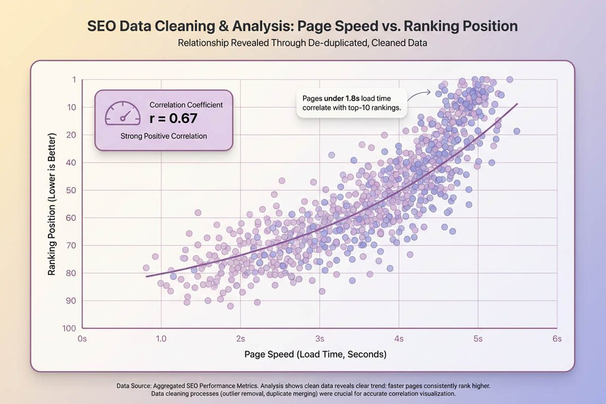 Raw data from multiple sources contains duplicates, missing values, formatting inconsistencies, and outliers that skew results if unaddressed. Statistical methods identify anomalies: traffic spikes from bot attacks, ranking fluctuations from SERP personalization, or conversion data corrupted by tracking errors. Quality data enables confident decision-making; poor data quality undermines every subsequent analysis.