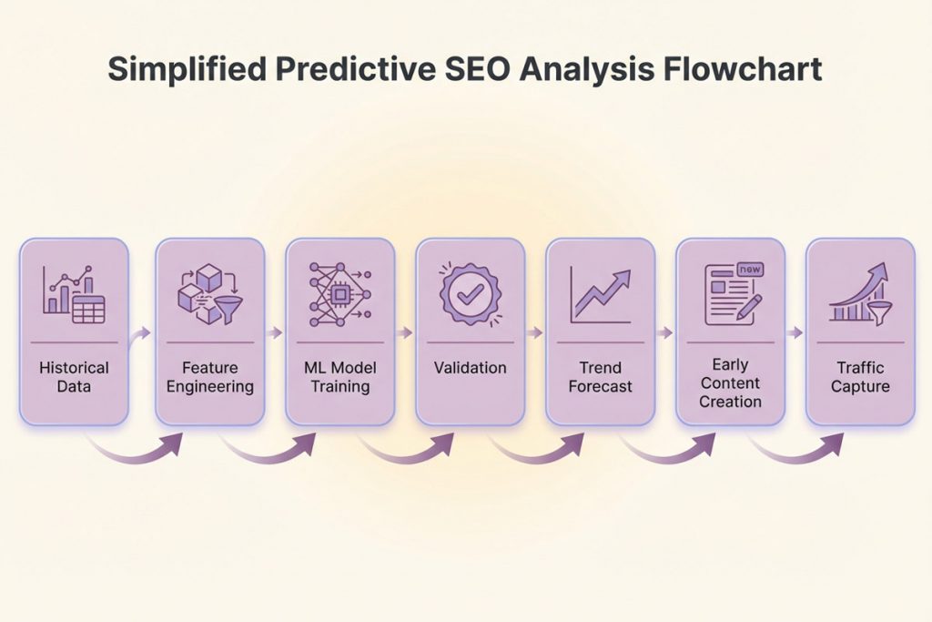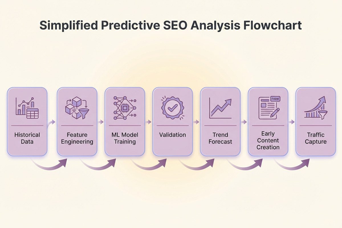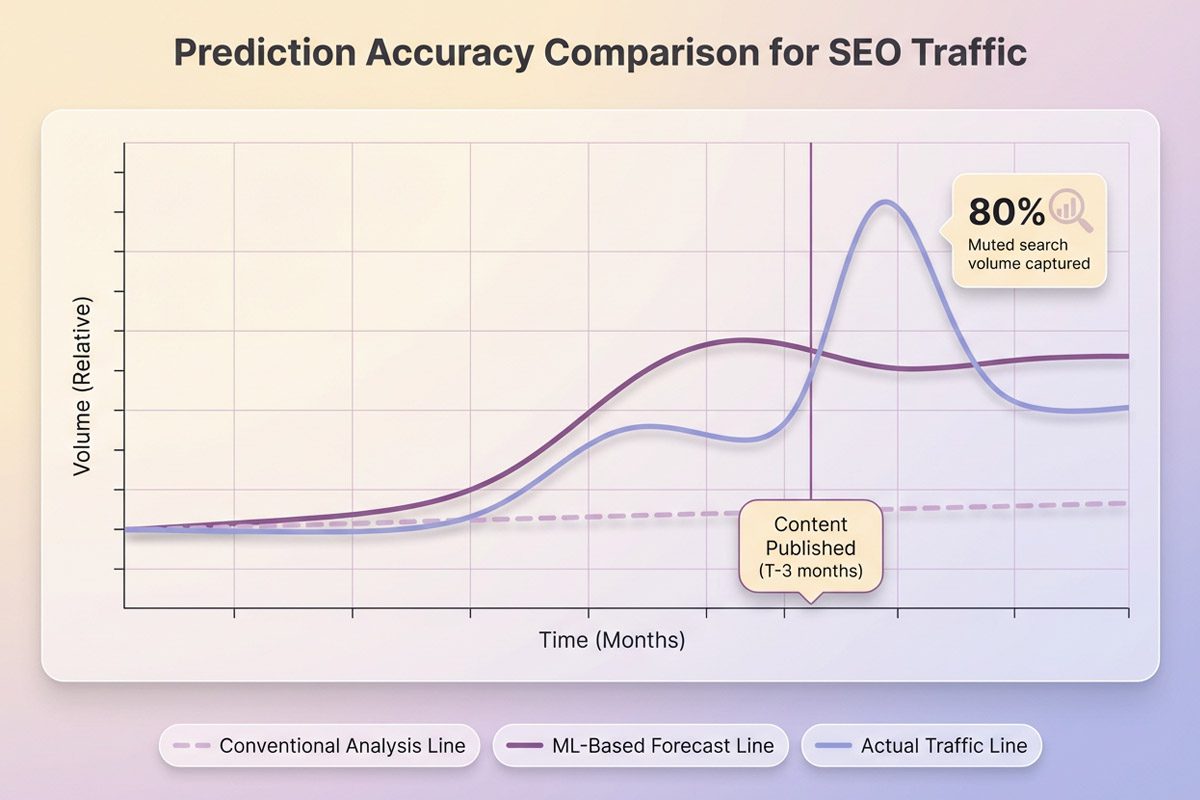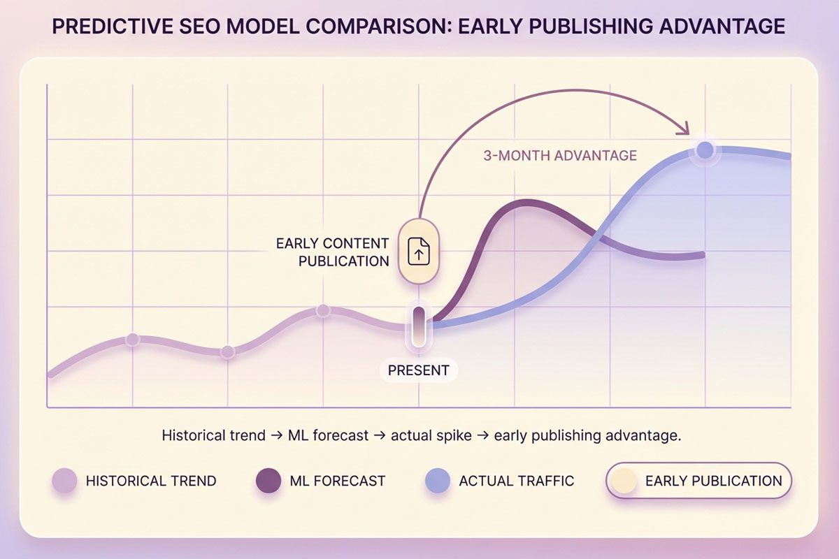 Predictive analytics analyzes historical data, seasonal patterns, and trend indicators to forecast traffic with 65-85% accuracy. One financial services client identified an emerging regulatory change six months before search volume peaked—content published early ranked #1 throughout the surge, capturing 80% of total search volume across related queries.