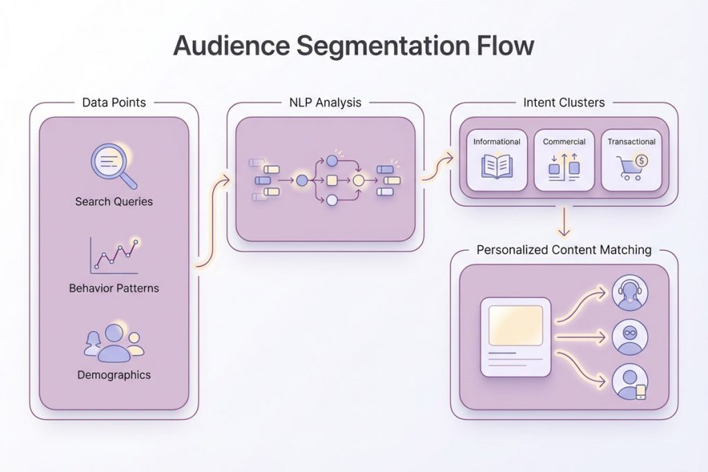 NLP enables true audience segmentation beyond basic demographics. Natural language processing analyzes search query patterns to classify user intent—informational, commercial, transactional—with precision traditional keyword research can’t match. Organizations implementing data-driven personalization report engagement increases of 30-50% across segmented content variations.