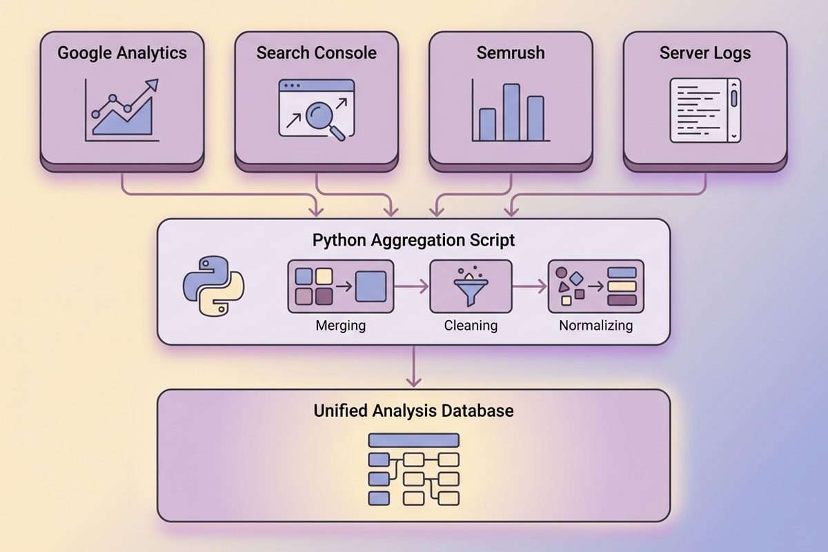 Google Analytics and Google Search Console provide core performance metrics. Semrush adds competitive intelligence—competitor keywords, backlink profiles, and ranking volatility. Custom extraction techniques using Python and web scraping expand data sources beyond standard platforms. Comprehensive data collection uncovers insights affecting significant traffic portions that standard analytics miss.