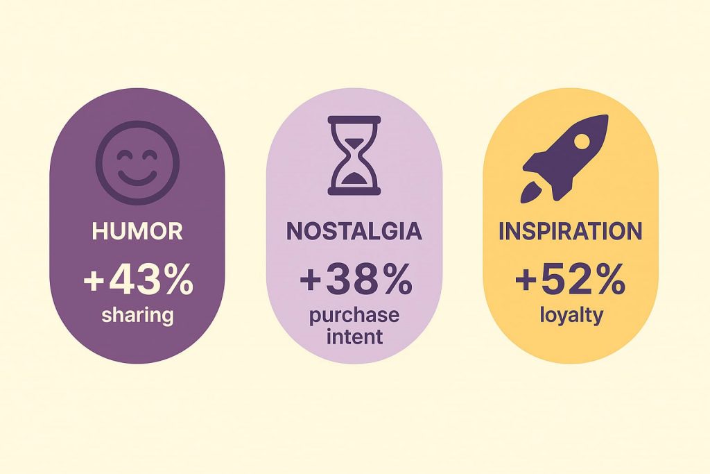 The most powerful emotional marketing connects your brand with specific feelings and contexts. Humor increases sharing by 43%. Nostalgia drives 38% higher purchase intent. Inspiration creates 52% stronger brand loyalty. Master these psychological principles, and you’ll transform one-time viewers into lifetime customers.