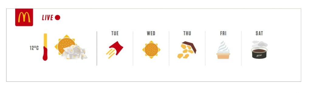 McDonald’s Netherlands displayed different products based on weather — coffee when cold, ice cream during heat waves. This contextual marketing increased featured item sales 38%.
