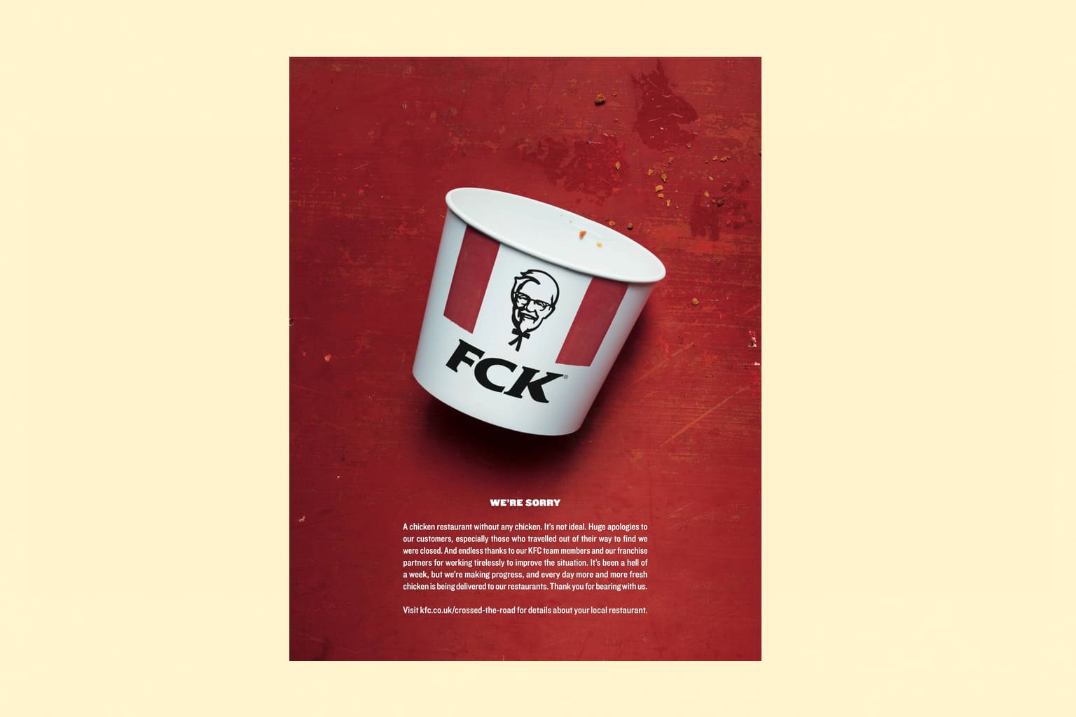 When KFC ran out of chicken in 2018, they responded with humorous advertising that transformed disaster into authenticity. The print ad simply rearranged their bucket letters to spell “FCK” with a genuine apology. This crisis management moment became textbook brand communication.