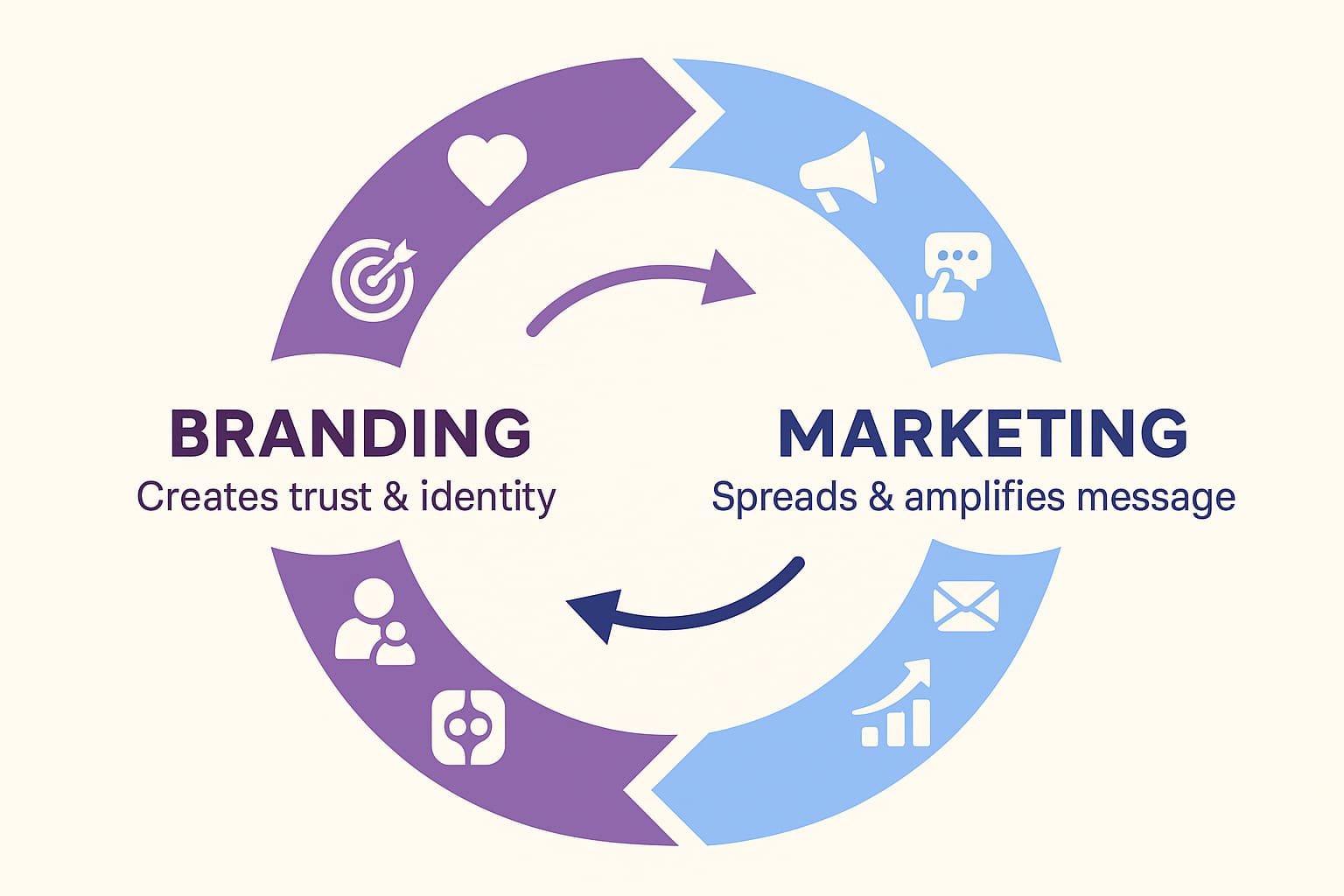Branding and marketing aren’t competitors for your budget — they’re dance partners that make each other look good. Your brand provides the foundation that makes your marketing believable, while your marketing activities reinforce and spread your brand message. It’s a symbiotic relationship that, when properly aligned, creates exponential results.