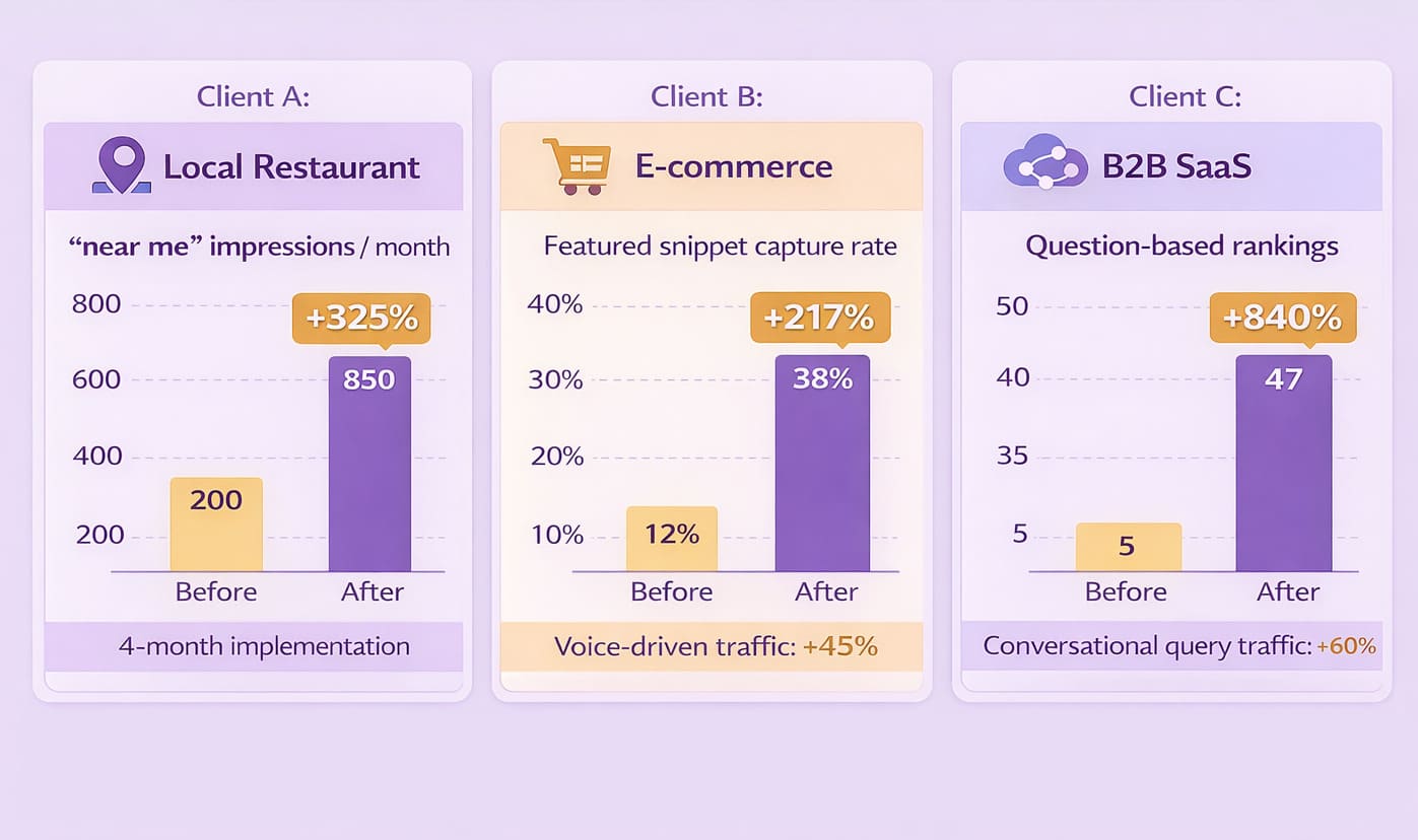 Client success validates the framework. A restaurant client achieved 325% increase in local voice search visibility. An e-commerce client saw 45% traffic growth from featured snippet strategy. A B2B client gained 60% more conversational query rankings.