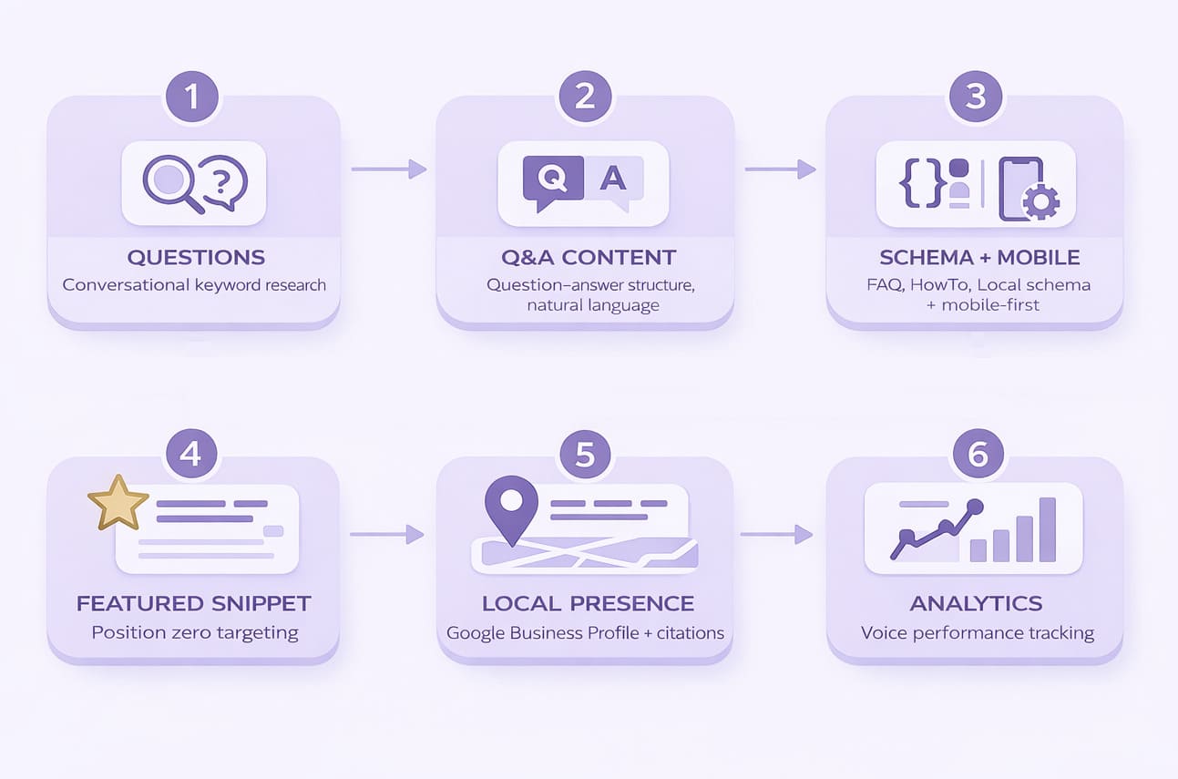 The framework includes conversational keyword research for question-based queries, content structure optimization with question-answer format, technical implementation through schema markup and mobile-first design, featured snippet targeting for position zero, local presence enhancement via Google Business Profile, and measurement systems for voice-specific analytics.