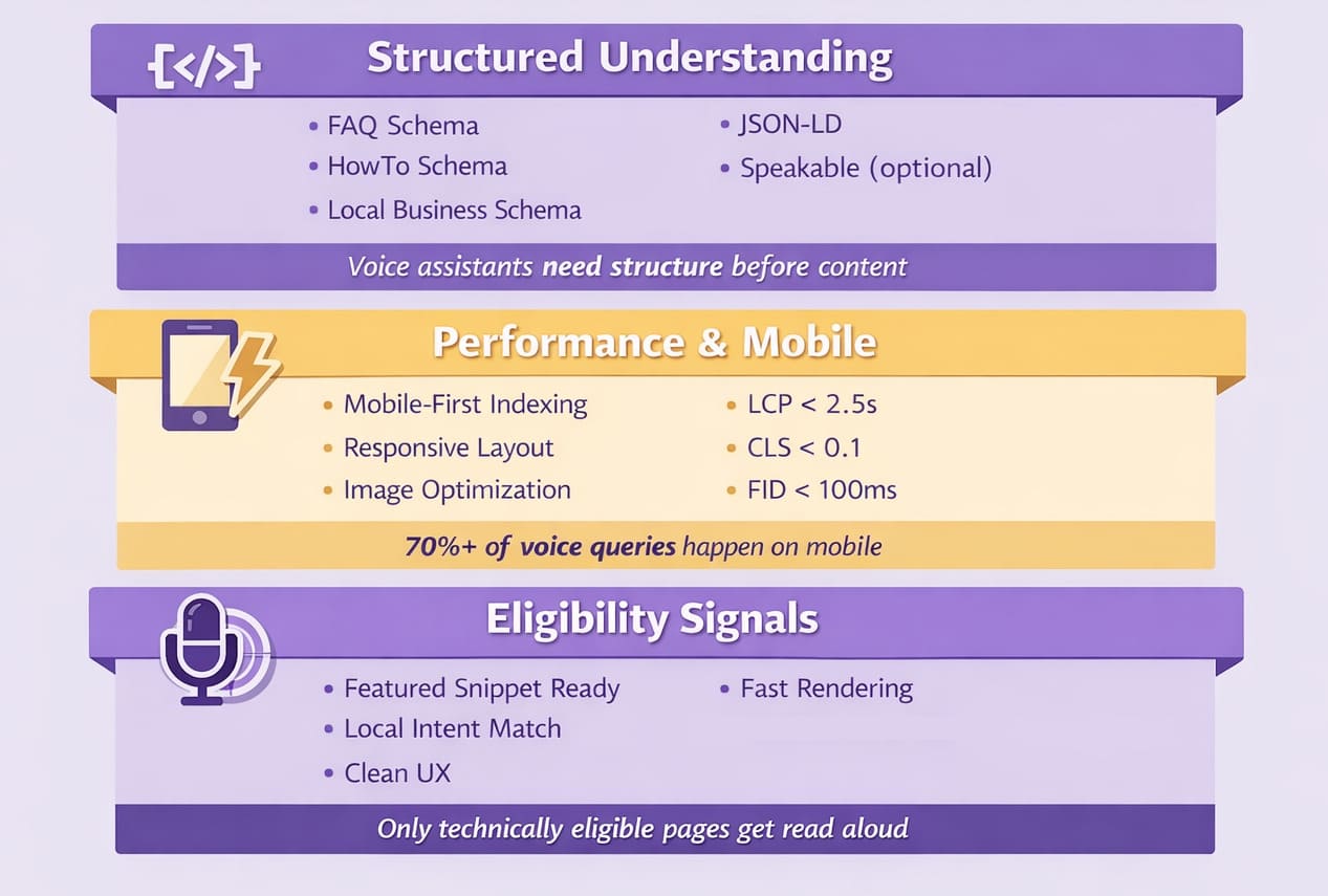 Voice search relies on structured, fast-loading, mobile-optimized content. Technical foundation enables content selection for voice results through three pillars: schema markup, page speed, and mobile optimization.