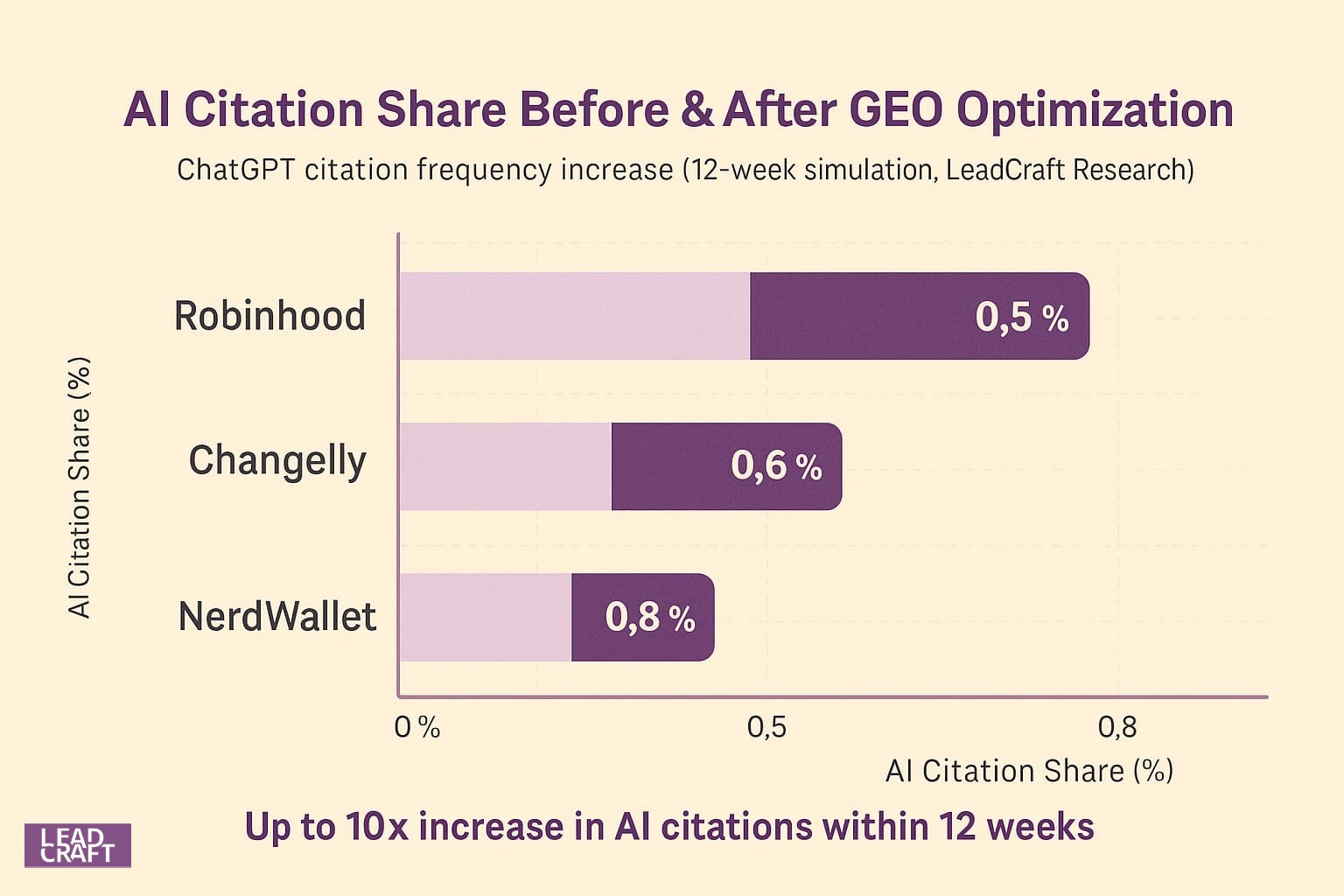 In conclusion, the 12-week research by Lead Craft marketing agency provides compelling evidence of GEO effectiveness: by systematically enriching content and aligning it with AI citation preferences, Robinhood and Changelly dramatically grew their presence in ChatGPT’s outputs. These results, though simulated, are grounded in real-world patterns and illustrate a repeatable playbook for any brand looking to establish thought leadership in the AI-driven content landscape.