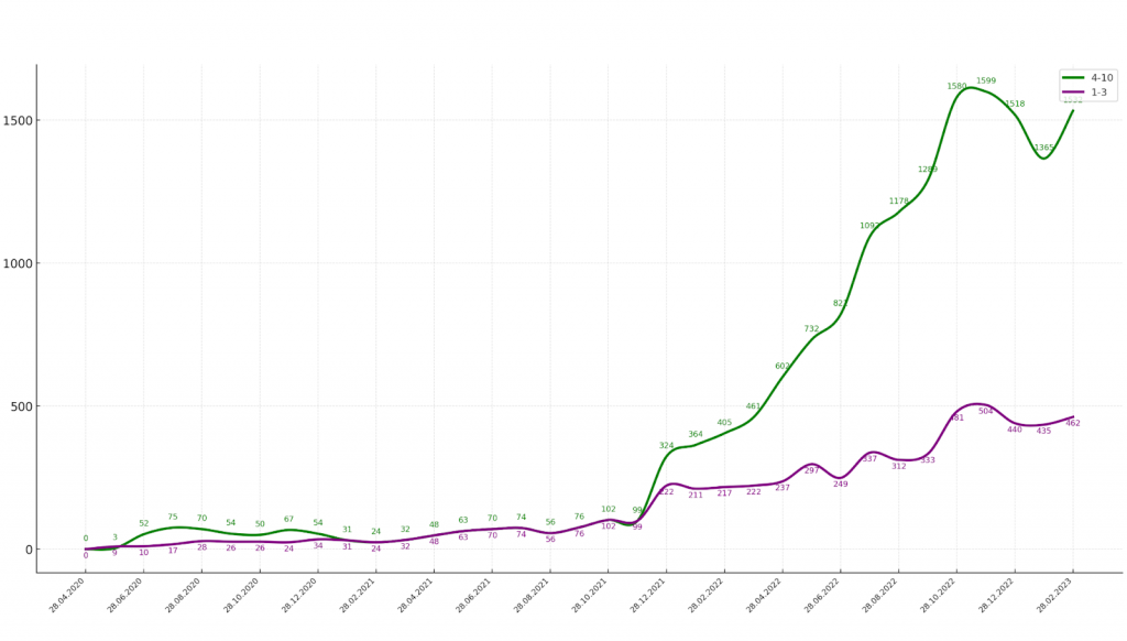 In relative terms: over 18 months, 51. 5% of targeted commercial keywords reached top-10, 30% reached top-5, and 20% reached top-3 positions. These metrics increased by 3x, 5x, and 7x respectively.
