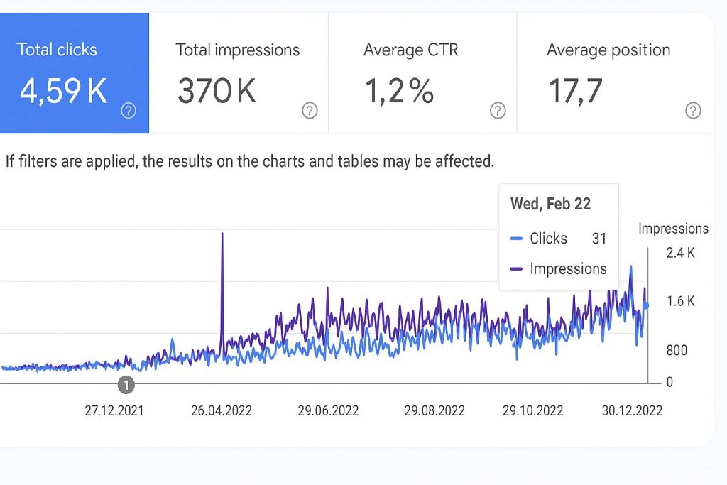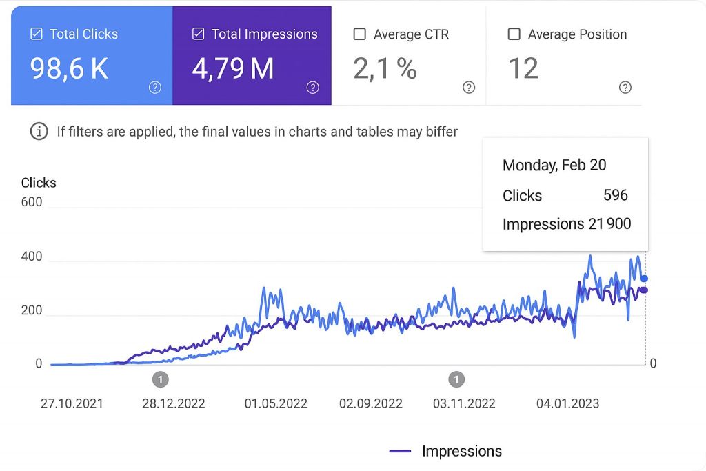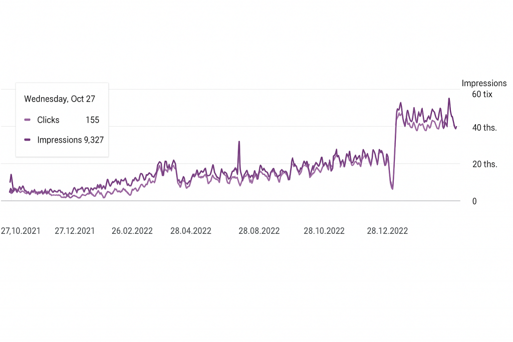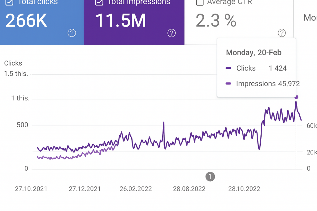 Daily organic traffic increased 9x: from 155 to 1, 424 visits. Impressions grew 5x: from 9, 327 to 45, 972.