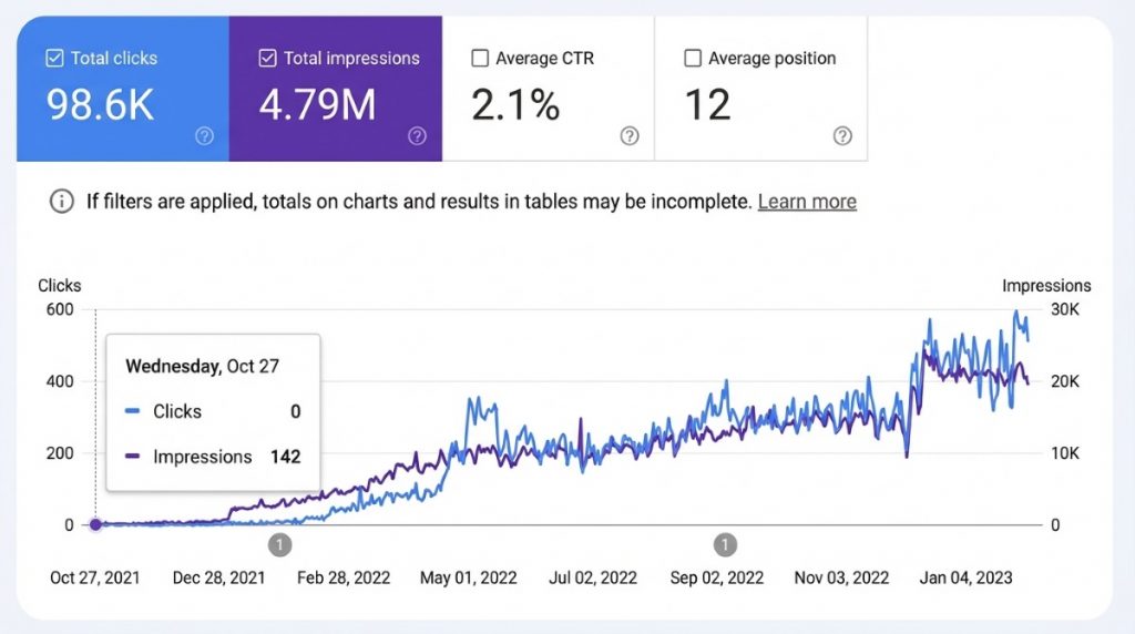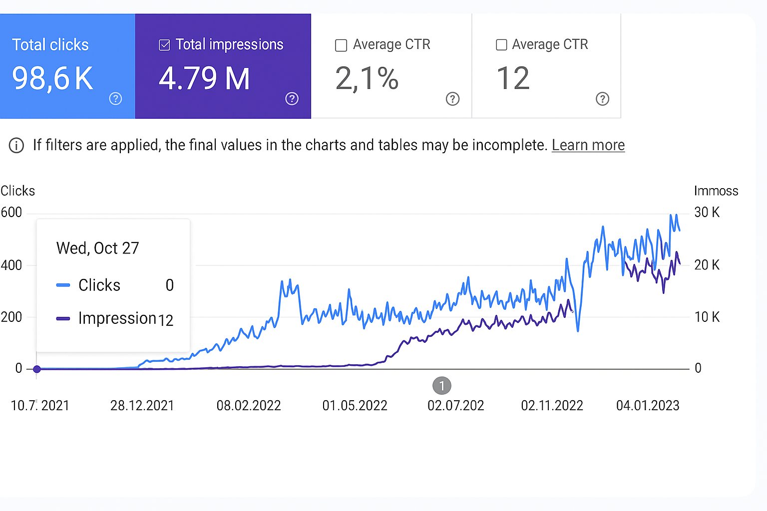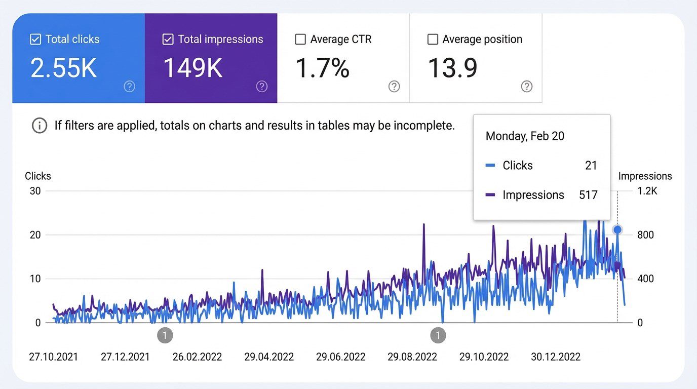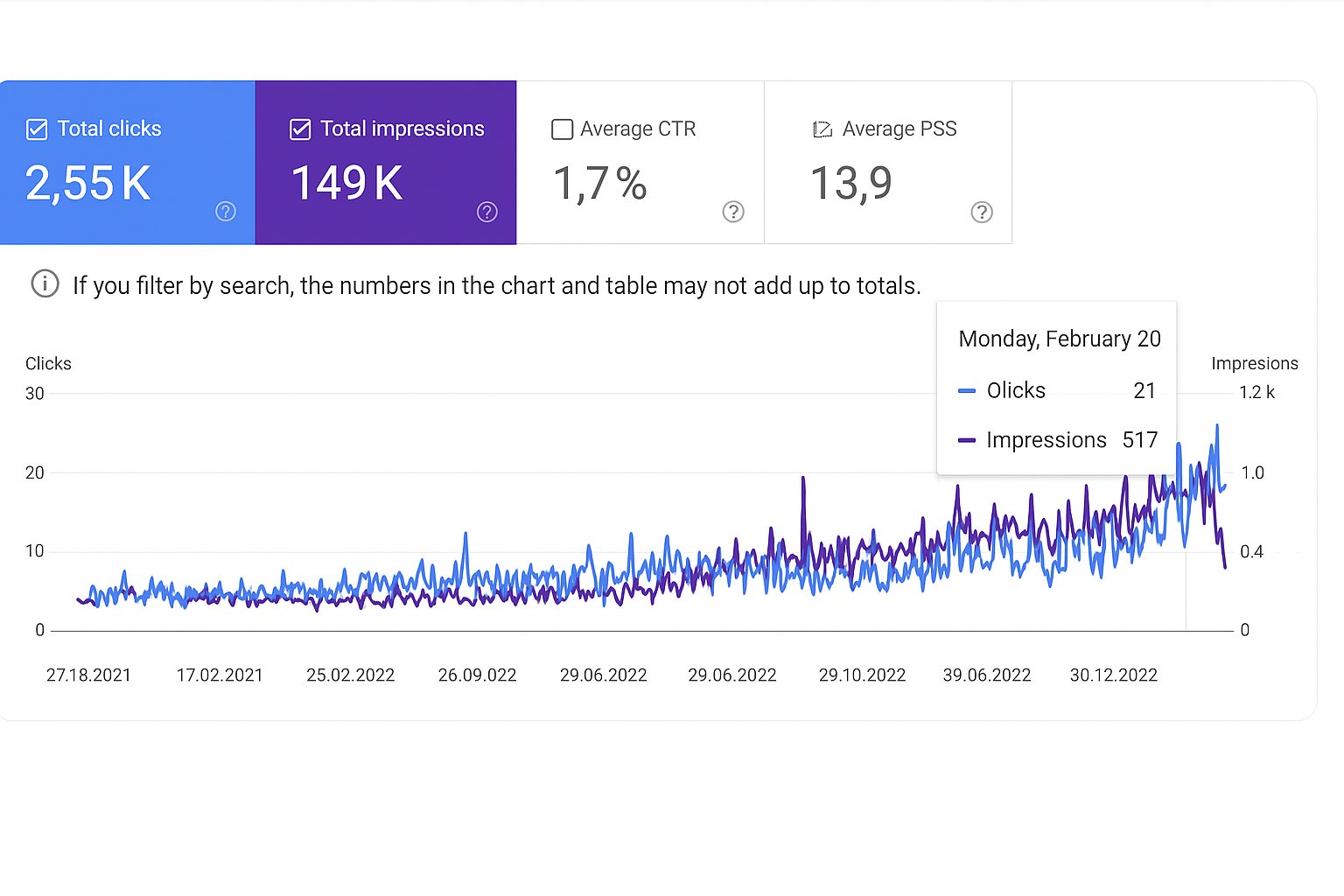 Daily organic traffic increased 9x: from 155 to 1, 424 visits. Impressions grew 5x: from 9, 327 to 45, 972.