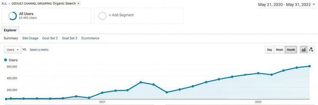 Over the first 18 months — from May 2020 to September 2021 — website traffic grew steadily. However, we aimed for even greater results. By resolving the product card indexing challenge, we unlocked significant traffic growth. As a result, the product showcase and individual product cards began ranking in Google’s top 3 search results for hundreds of thousands of keywords.