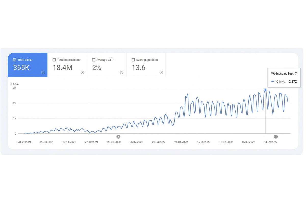 Website traffic grew 100x in one year, with daily clicks increasing from 29 in September 2021 to 2, 872 in September 2022.